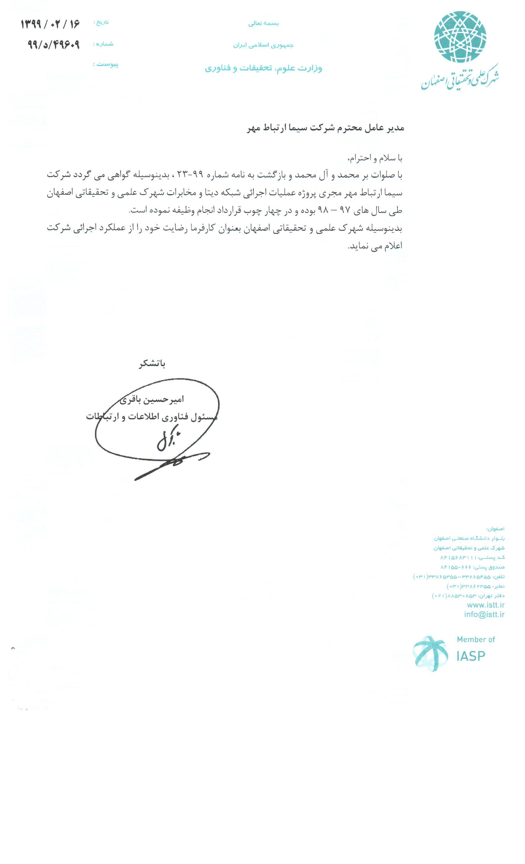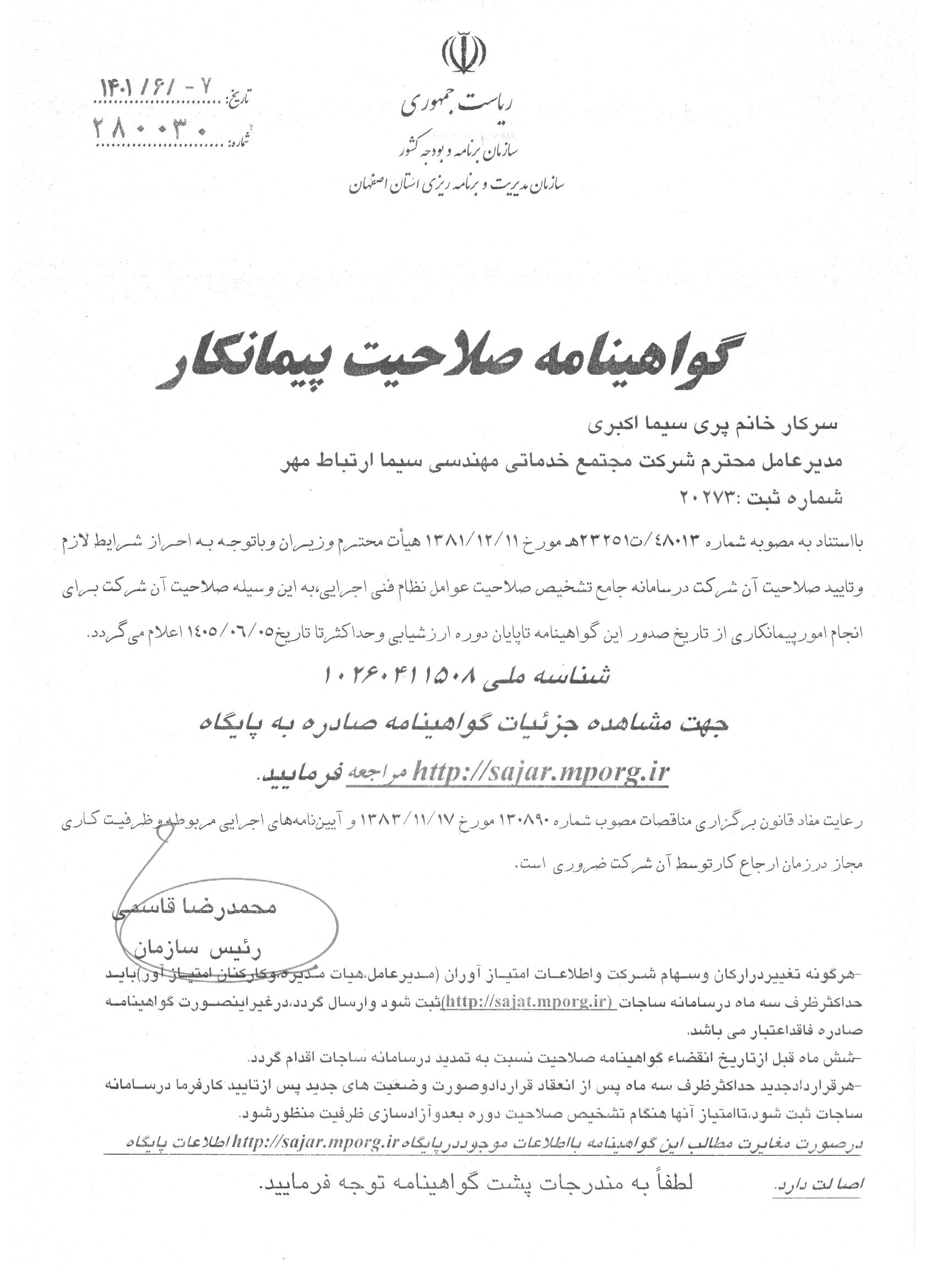 شركت سیما ارتباط مهر فعالیت خود را در تاریخ دهم اردیبهشت سال1382 با بهره گیری از مهندسین مجرب در زمینه اجرای عملیات پیمانکاری ارتباطات ، تاسیسات و نجهیزات ، ارائه خدمات در زمینه امور کامپیوتری،مخابراتی ، الکترونیکی ، مشاوره خرید و فروش و تامین قطعات انواع سیستم های کامپیوتری- مخابراتی و الکترونیکی ،تعمیر و نگهداری ساختمان و تاسیسات ، انجام كليه خدمات اداري و بازرگاني، تامين نيروي انساني موقت اعم از متخصص و فني و امور مرتبط با موضوع شركت آغاز نمود.